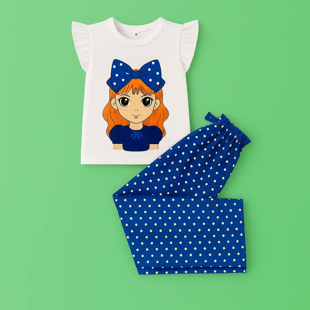 Blue Bow Kids Girl Summer Set – White T-Shirt & Polka Dot Shorts