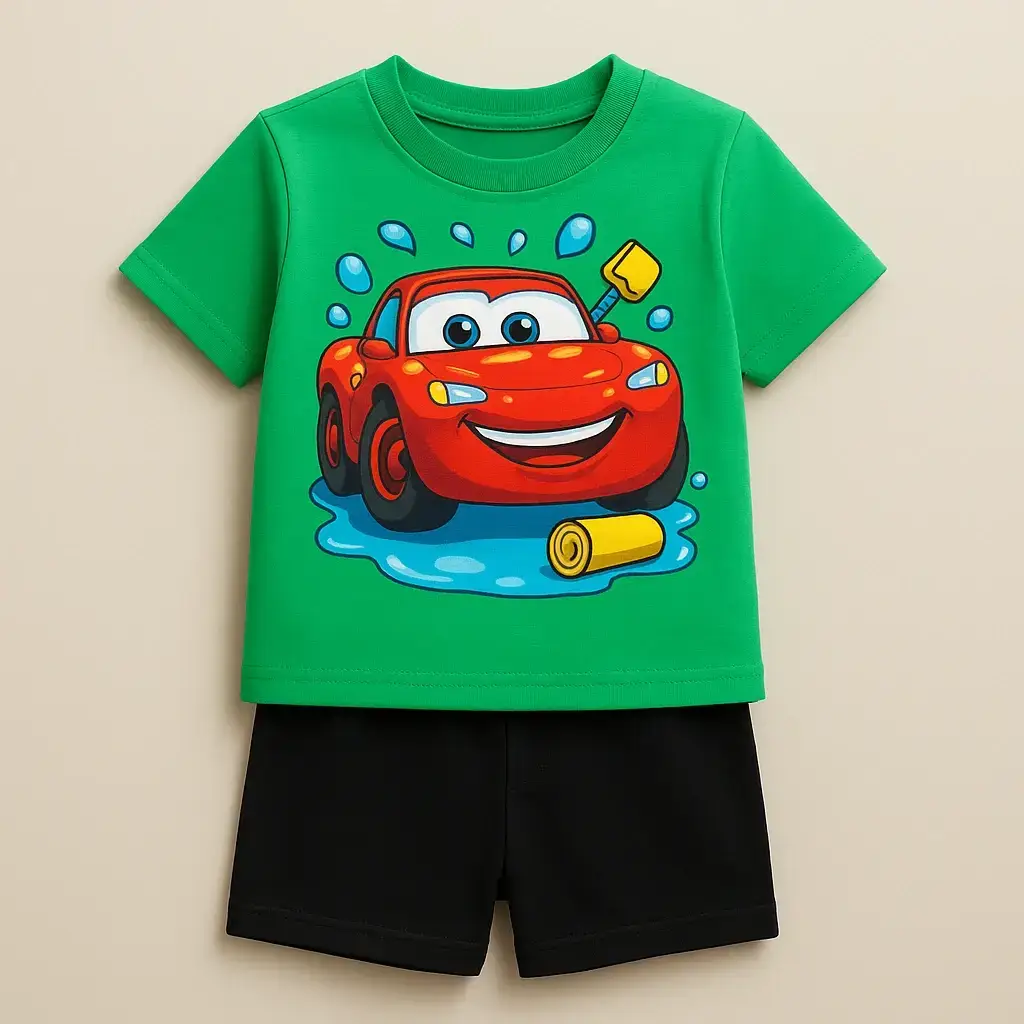 Parents love the Boys Green Cartoon Car Summer Set because it combines affordability, durability, and trendy design. The set remains soft and fresh after repeated washes, making it a practical investment for kids’ wardrobes.