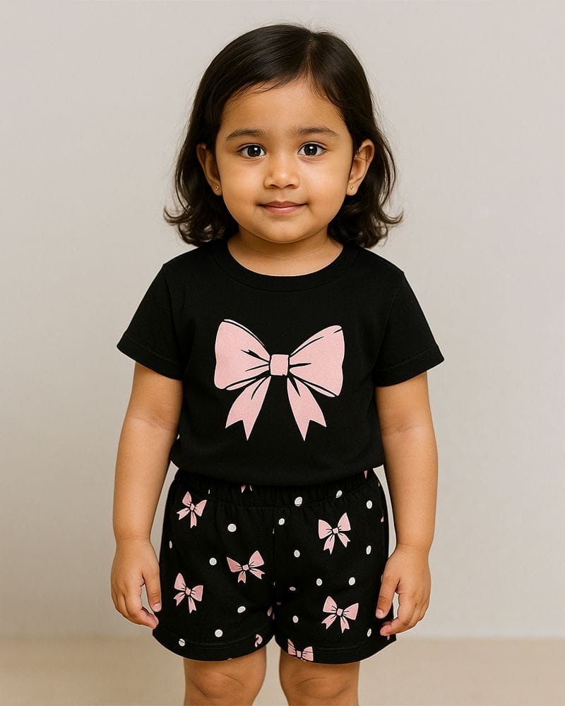Let your little girl shine in this stylish black summer set featuring sweet pink bows and playful polka dots – perfect for everyday fun!