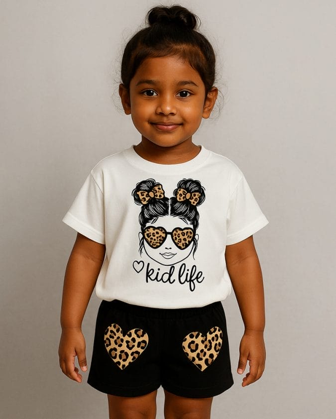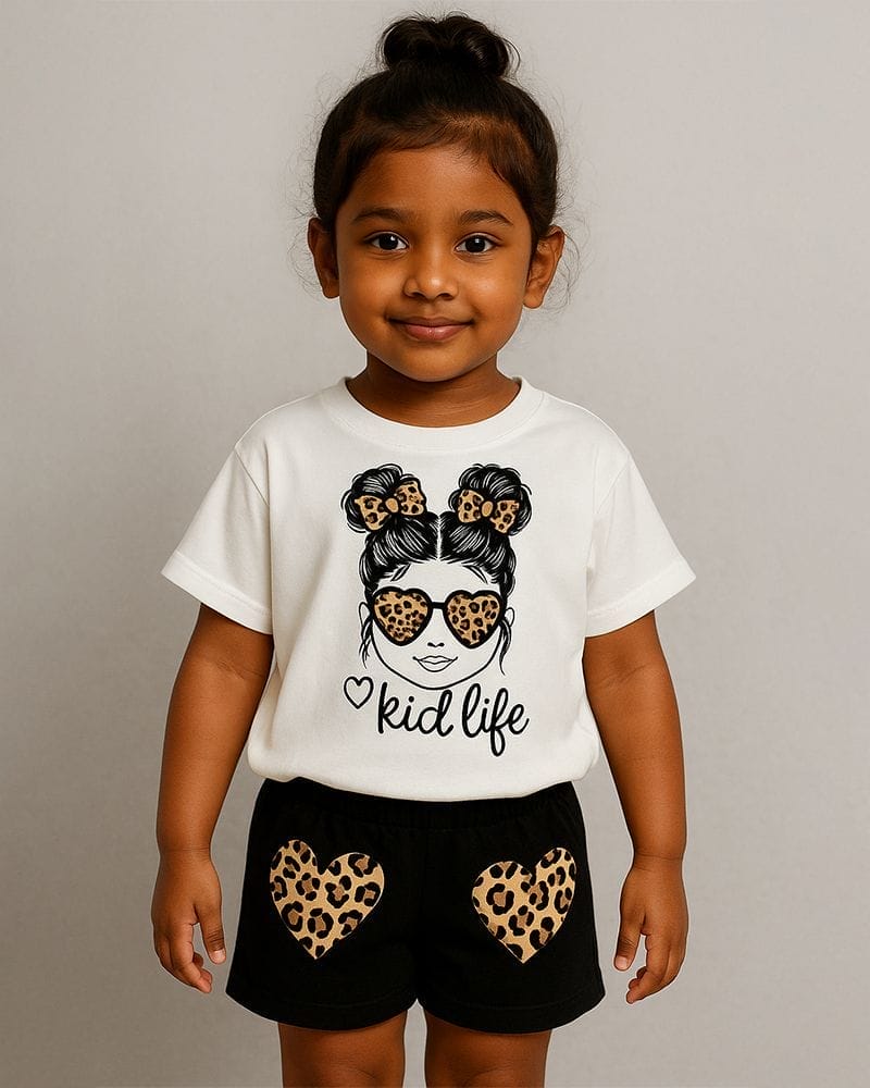 Kid Life White T-Shirt & Black Shorts Set for Girls – Leopard Print Design