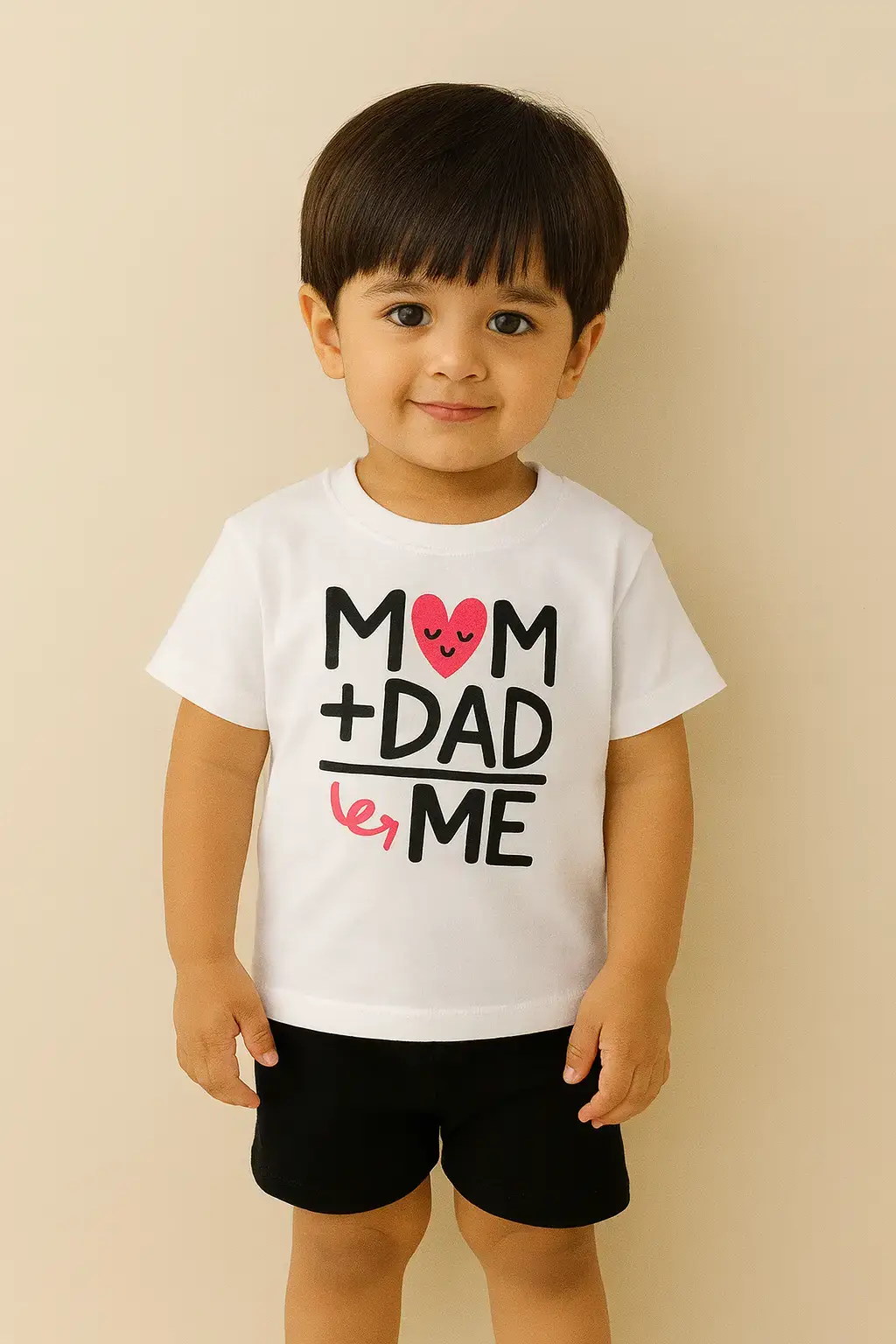 Celebrate family love with the Mom Dad Love Me Kids Summer Set. This white T-shirt features a sweet heart and bold text design, paired with classic black shorts for a smart and casual look. A perfect boys summer outfit for comfort, play, and family fun.