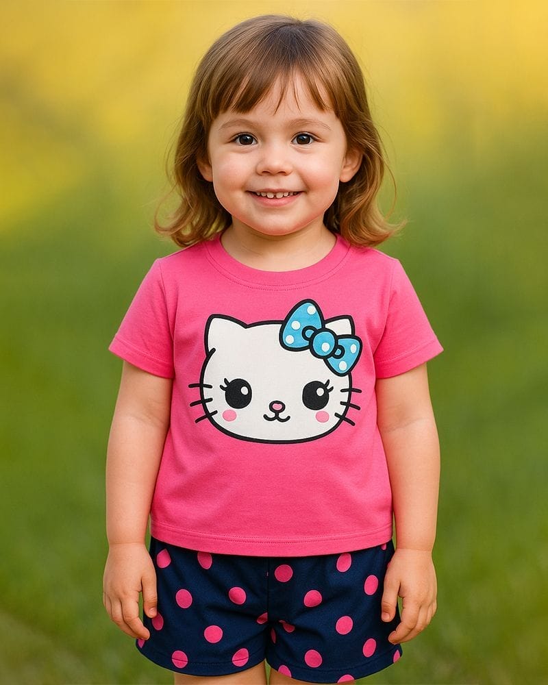 Let your little one shine with this cute cat face tee and playful polka dot shorts! A comfy and colorful summer set designed for fun-loving baby girls.