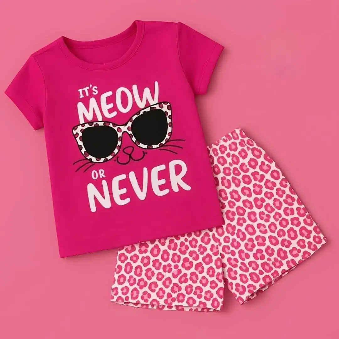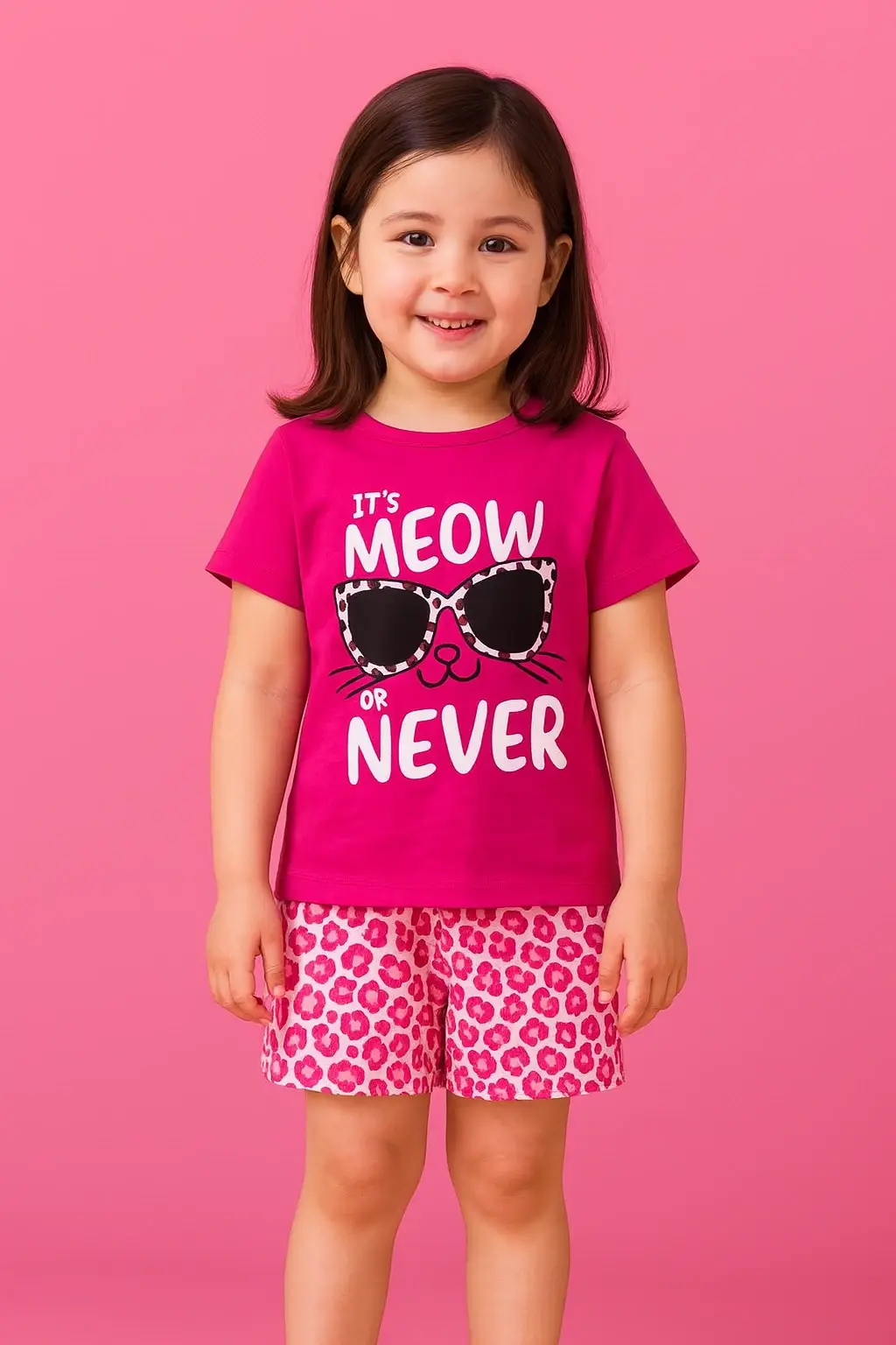 Let your baby girl step out in style with this vibrant outfit! The hot pink T-Shirt with “It’s Meow or Never” slogan and cute cat sunglasses print pairs perfectly with pink leopard print shorts for a fun summer look. Ideal for outings, birthdays, or everyday play.